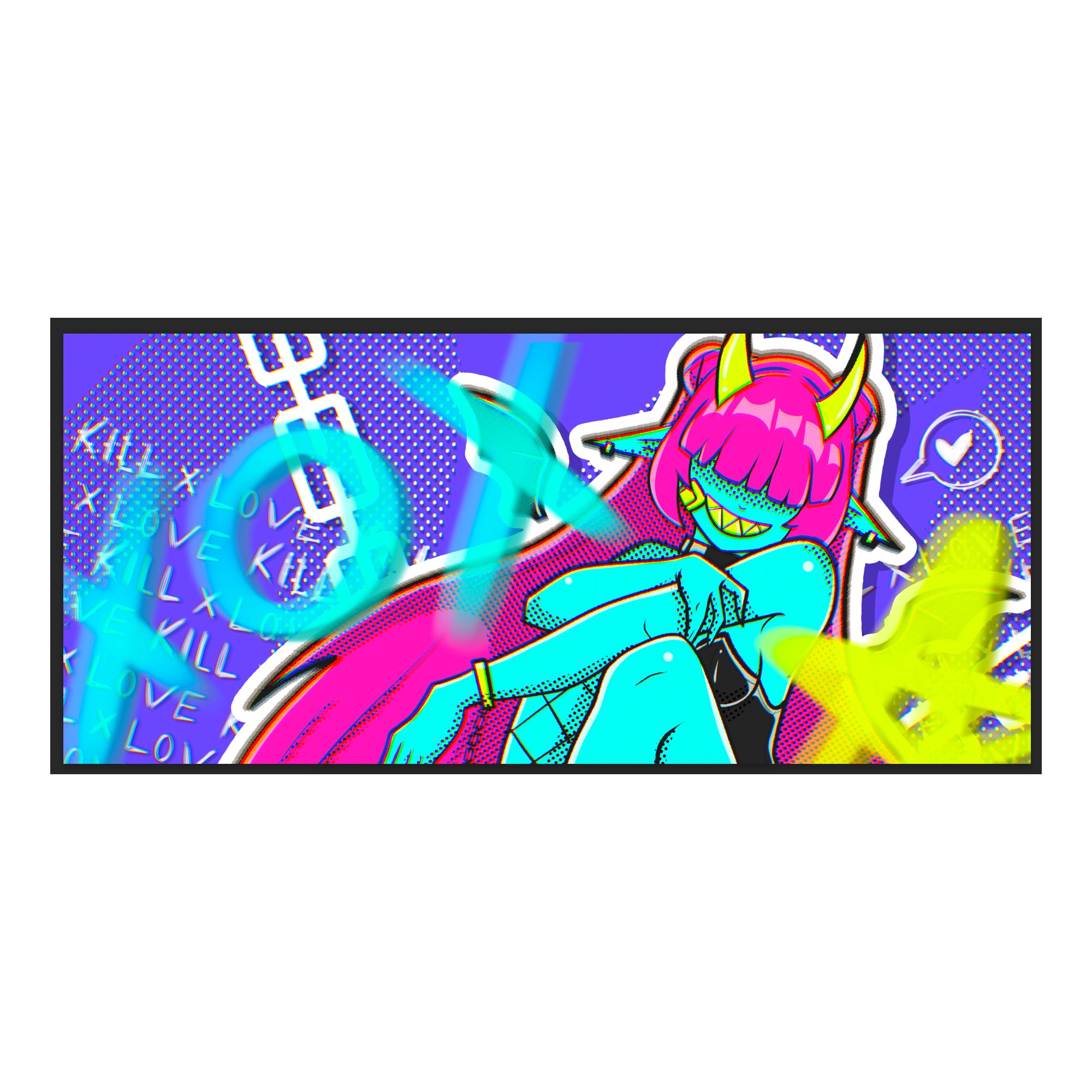 'KILLXLOVE' is inspired by the hyper-pop design language, featuring a colourful devil girl named Lilith surrounded by various motifs that create a chaotic yet enchanting atmosphere.